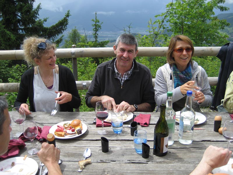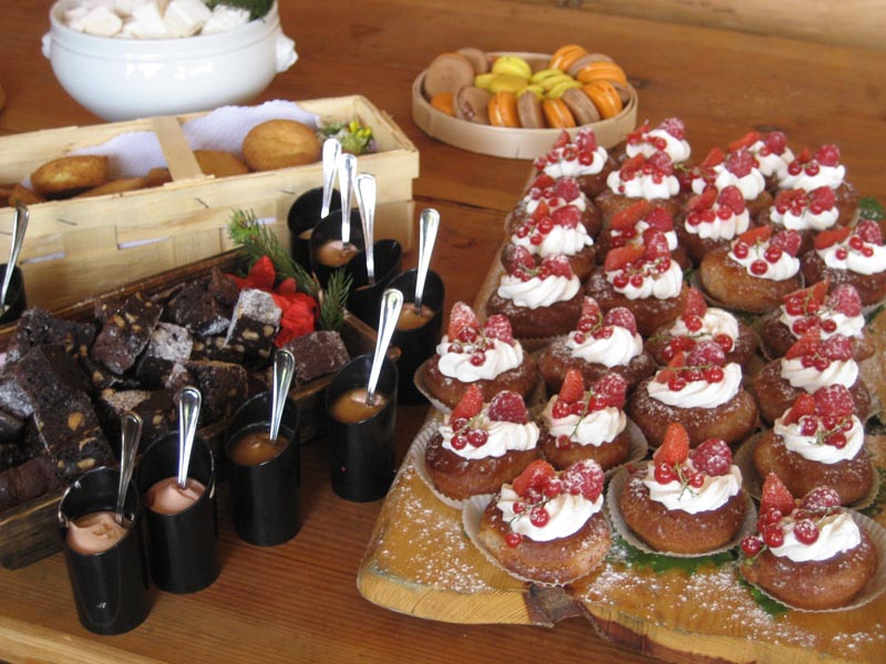 Jean-Louis und ein Teil der Küchenbrigade, mit einem üppigen Buffet basierend auf den Pflanzen die wir soeben kennen gelernt hatten, sowie Bernard Cavé von Ollon (www.bernardcavevins.ch) mit seinen feinen Tropfen und die Familie Dietrich, Direktion des Eurotel Victoria, die uns jedes Jahr großzügig ihr „Küchenteam“ zur Verfügung stellt, unter einer zögernden Sonne. Wir konnten, unter anderem, folgende Spezialitäten degustieren: Pomme d’amour mit Steinklee, Bricelet mit echtem Kümmel und geräuchertem Ziegerschaum, Entenbrust-Schinken mit Tannen-sprösslingen, und zur Nachspeise Tropézienne mit Waldmeister, Marshmallows mit Honig und Tannensprösslingen, ein Cake mit gemeiner Bärenklaue und Avocados, sowie eine ganze Auswahl von Makronen ( Zitrone-Sandthymian, wilde Minze-Schokolade, Klatschmohn, Karamell-Echter Mädesüß, . . . ) und viele andere ausgezeichnet schmeck-ende Leckereien.
