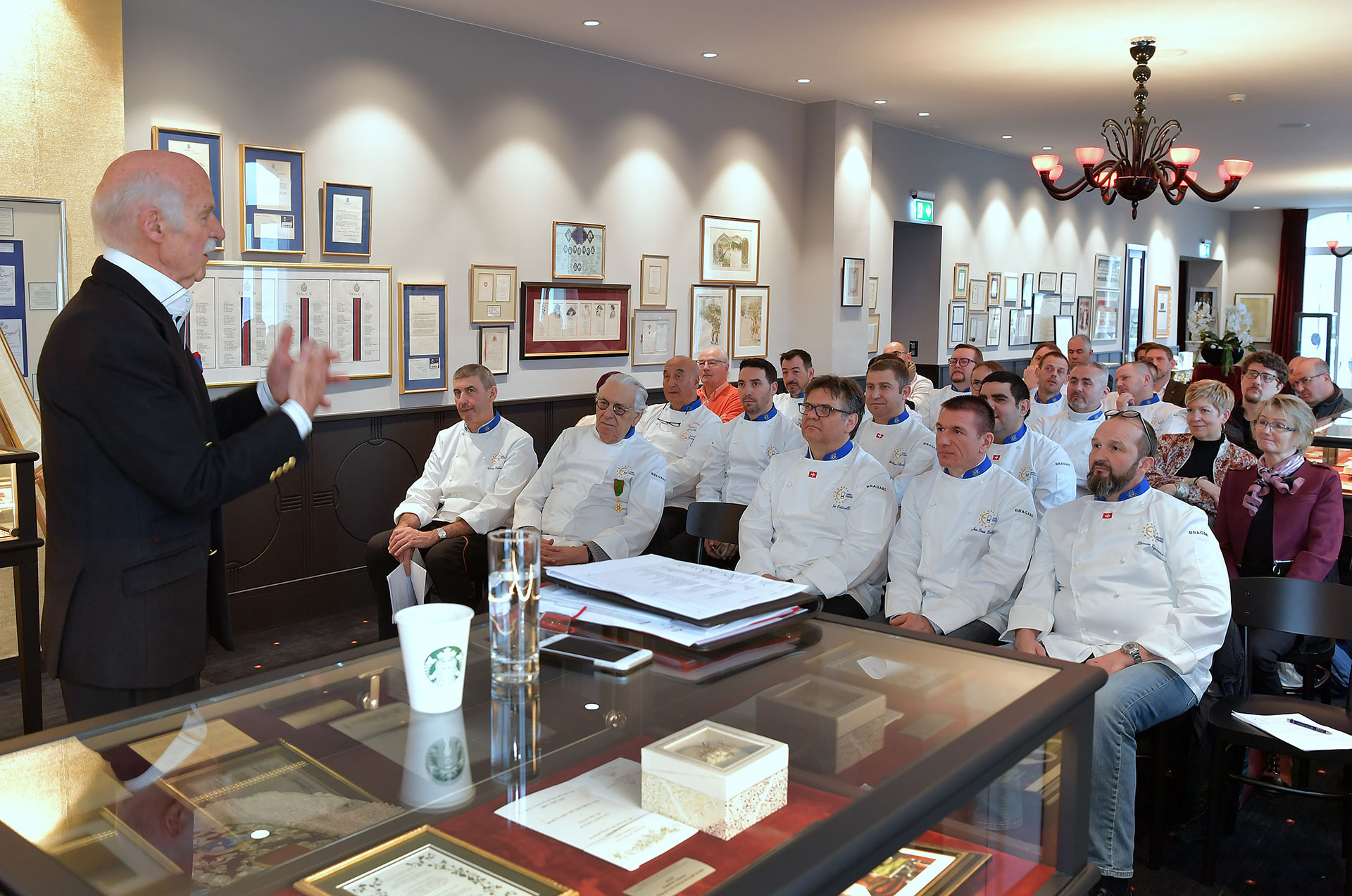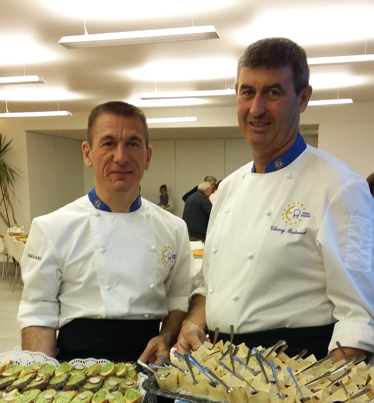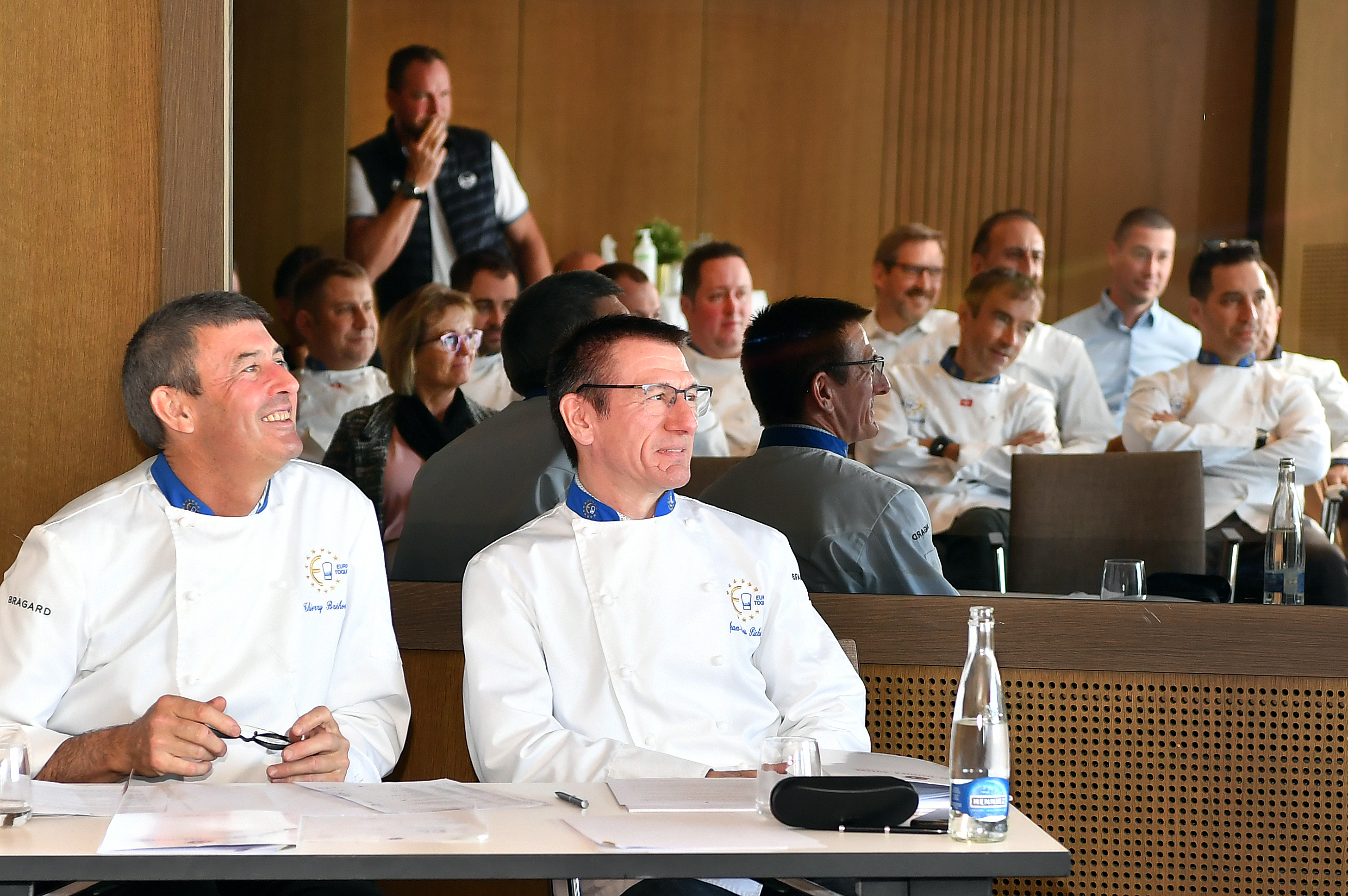 Les chefs Guillaume Gomez du palais de l'Elysée, Michel Roth de l'Hôtel Ritz à Paris et de l'hôtel Président Wilson à Genève, membres du « Comité des sages » nouvellement élu, ont fait une intervention pour rappeler le caractère spécifique de notre association qui est la défense des produits du terroir à Bruxelles.