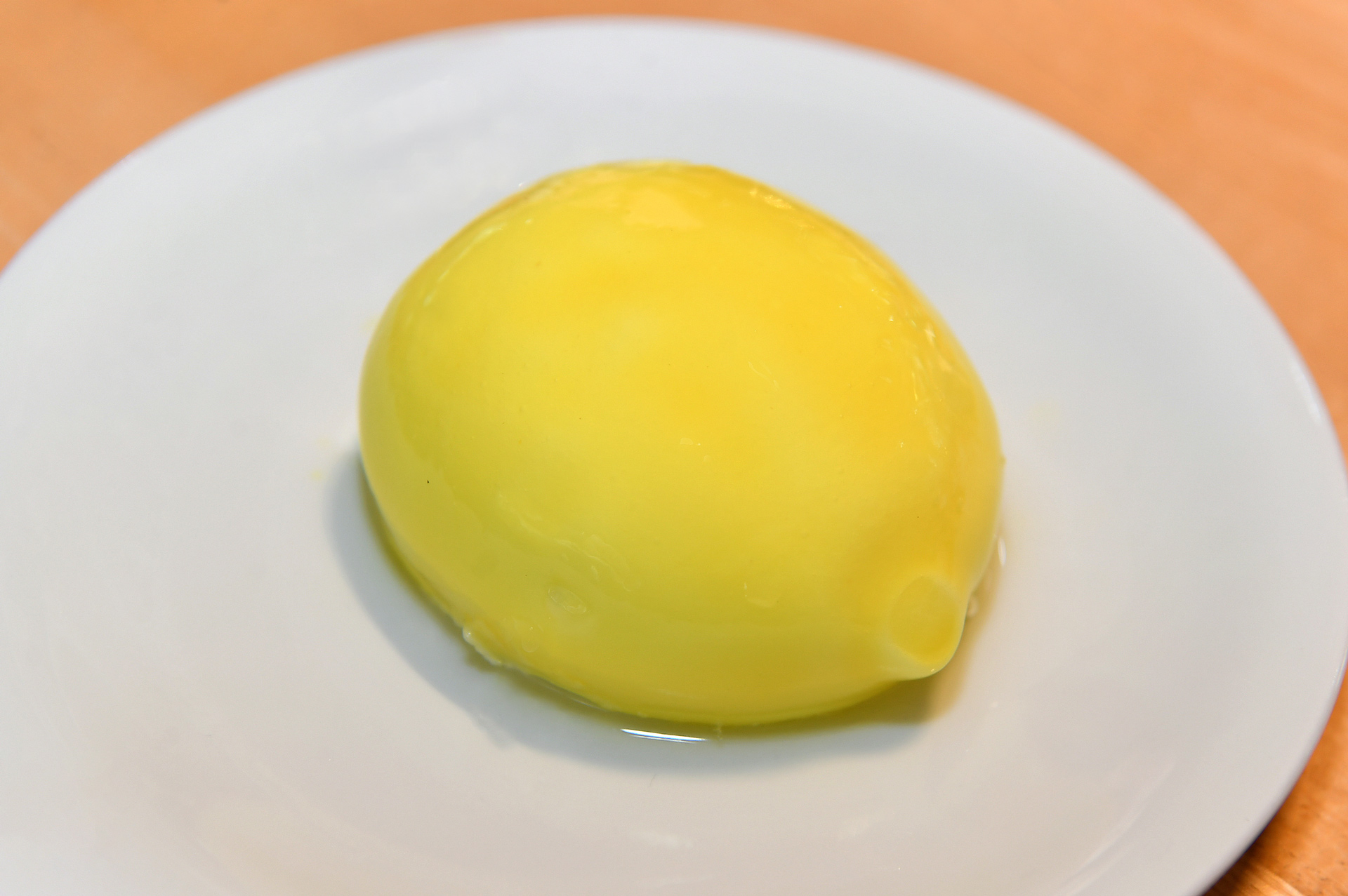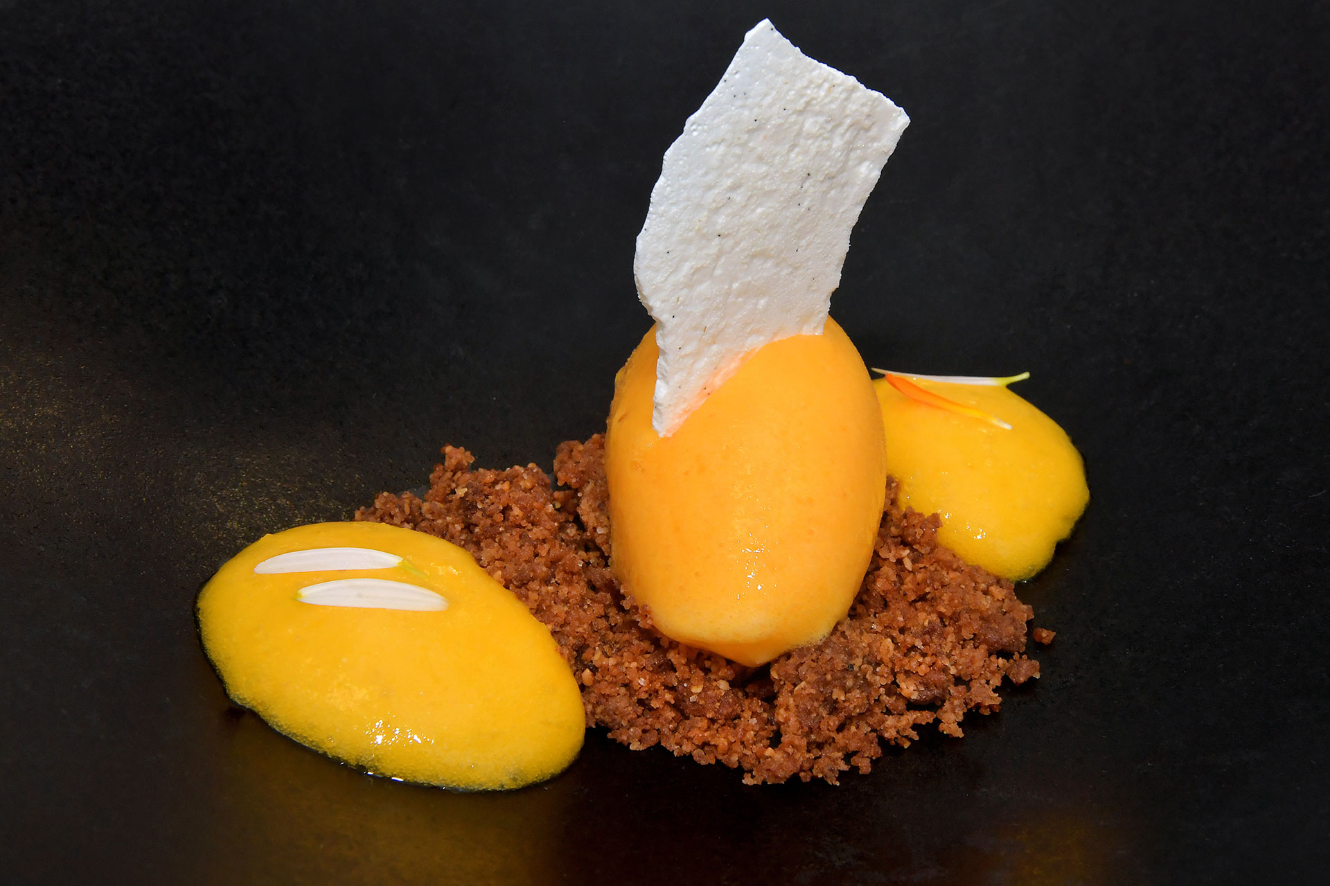 Cylindre acidulé à la mandarine de Sicile, meringue moelleuse et pépites croquantes, tube glacé au yaourt et huile d'olive