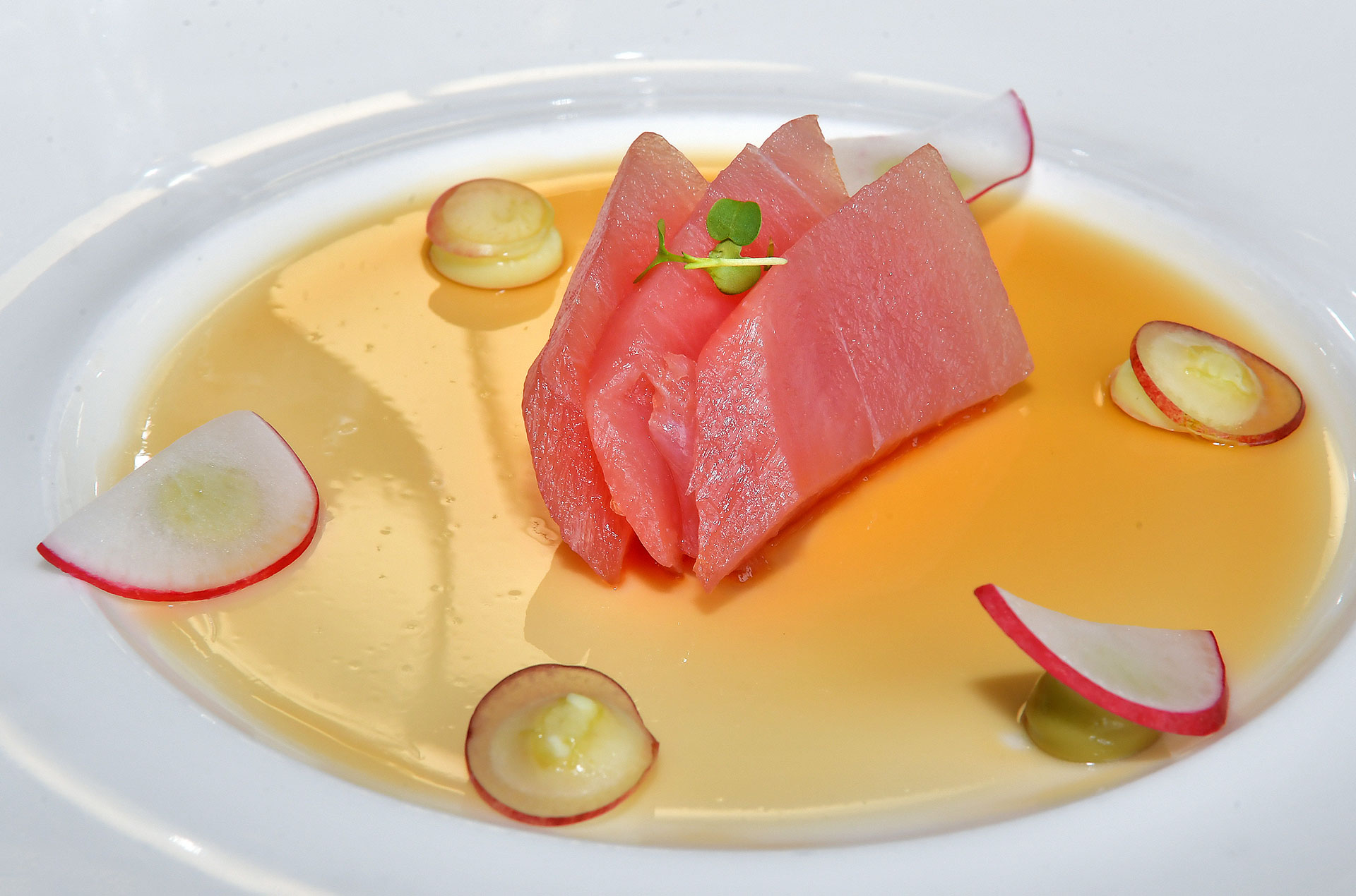 Bouchées de gros dormeur des côtes Bretonnes et seiche rafraichies au caviar « sélection », pomme verte et coriandre