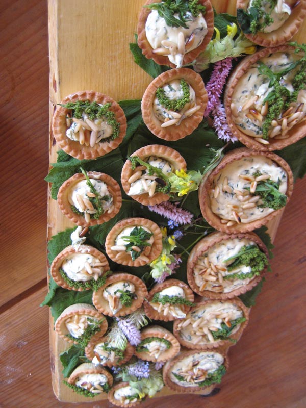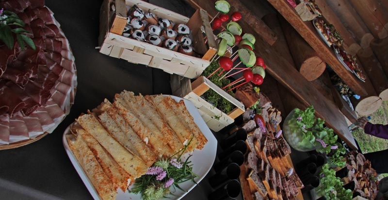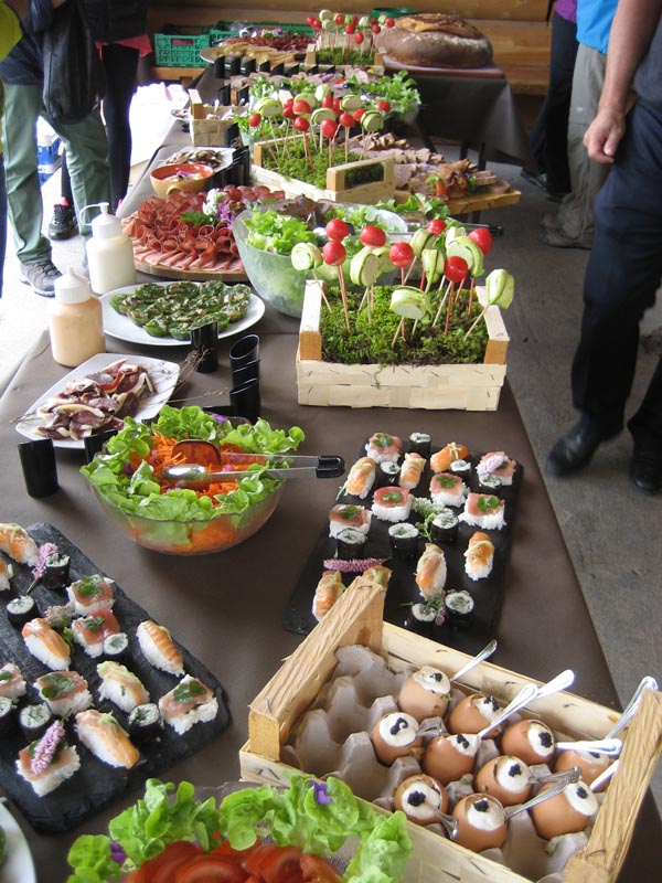 A la Cabane du Scex, qui surplombe Villars avec une belle vue, nos amis Jean-Louis, avec une partie de l’équipe de cuisine, un somptueux buffet sur la base des plantes que nous venions de découvrir, Bernard Cavé d’Ollon (www.bernardcavevins.ch) avec ses merveilles et la famille Dietrich, directeur de l’Eurotel Victoria, qui nous mets généreusement « à disposition ses cuisiniers », nous attendait sous un beau soleil. Nous avons pu déguster des Pomme d’amour au mélilot, des Bricelets au cumin des prés et mousse de séré fumé, du Jambons de magrets aux bourgeons de sapin et en dessert des Tropézienne à l’aspérule odorante, des Guimauve au miel de bourgeons de sapin et un cake à l’avocat et berce ainsi qu’un assortiment de macarons, (citron-serpolet, menthe sauvage-chocolat, coquelicot, caramel-reine des prés…) et beaucoup d’autres bonnes choses.