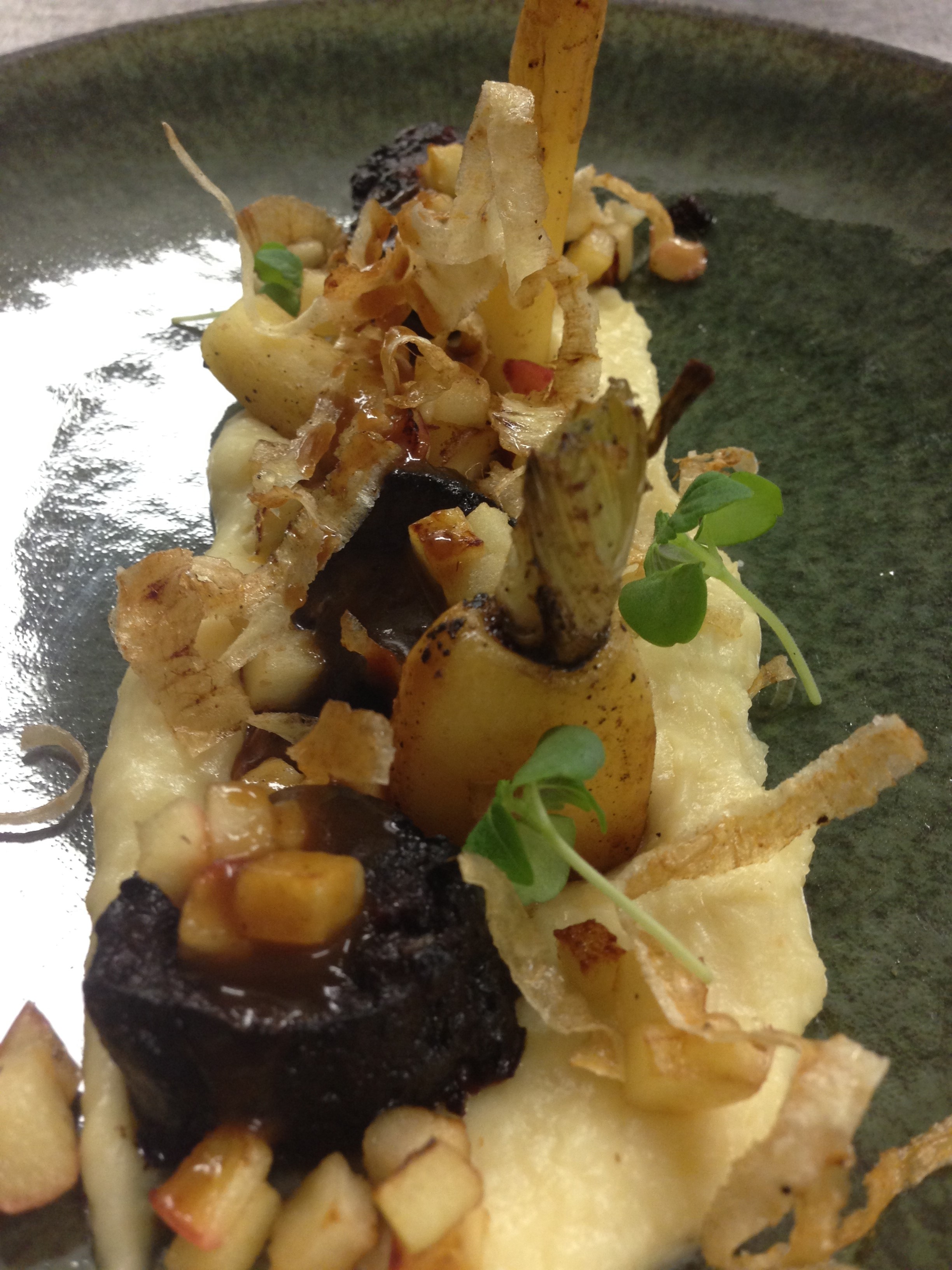 Dresser des fines tranches de boudin séché légèrement chauffé sur une purée de panais. Accompagner le plat de petits panais rôtis & napper avec une sauce aux grains de café et poudre d'acacia.